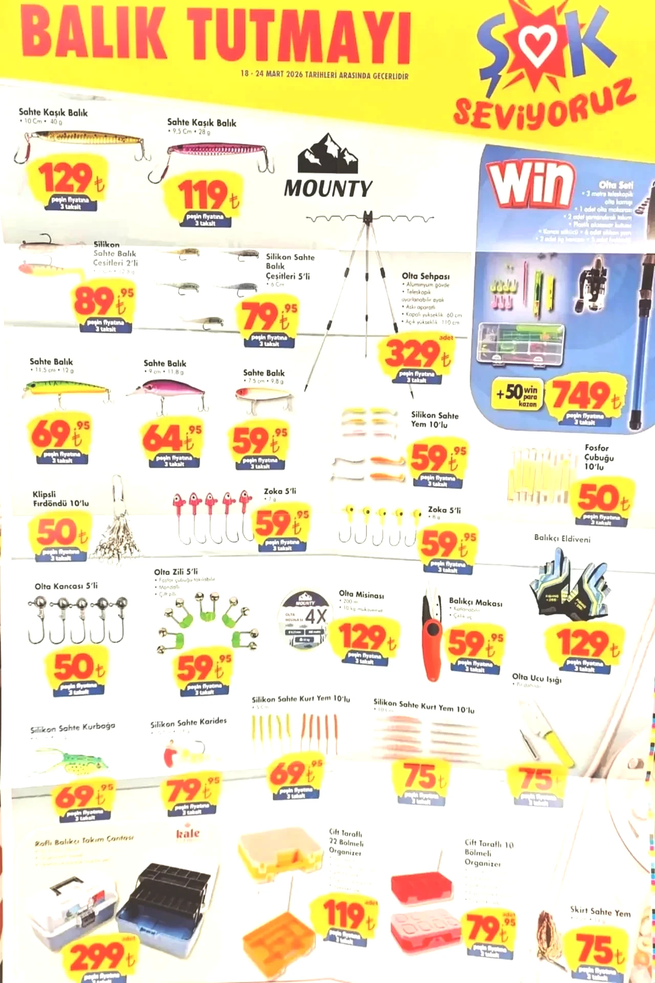 ŞOK marketlerinde yeni haftanın aktüel ürünleri, yayımlanan katalog ile duyuruldu. Balıkçılık malzemeleri arasında yer alan olta sehpası, farklı sahte balık çeşitleri, olta misinası, balıkçı makası, balıkçı eldiveni, çanta gibi alternatf seçenekler raflardaki yerini alıyor. Bahçe ürünleri arasında bulunan ot biçme ve tırpan makinesi 1.490 lira, şarjlı budama makası 1.190 lira, şarjlı hava üfleme makinesi 999 lira, bahçe hortum seti 999 lira, taşınabilir hortum 449 lira, bahçe sulama tabancası ise 159 lira olarak fiyatlandırılacak. Ayrıca, 3 kollu döner fıskiye 229 lira, bahçe sulama tabanca seti 219 lira, bahçe eldiveni ise 39,95 liradan satışa sunulacak. Saksı çeşitleri ise 9,95 lira ile 69,95 lira arasında müşterileri bekleyecek. Temel gıda maddeleri, temizlik ürünleri ve kişisel bakım eşyaları da bu hafta öne çıkan diğer ürünler arasında yer alıyor. İşte, ŞOK 18-24 Mart aktüel ürünler kataloğu…